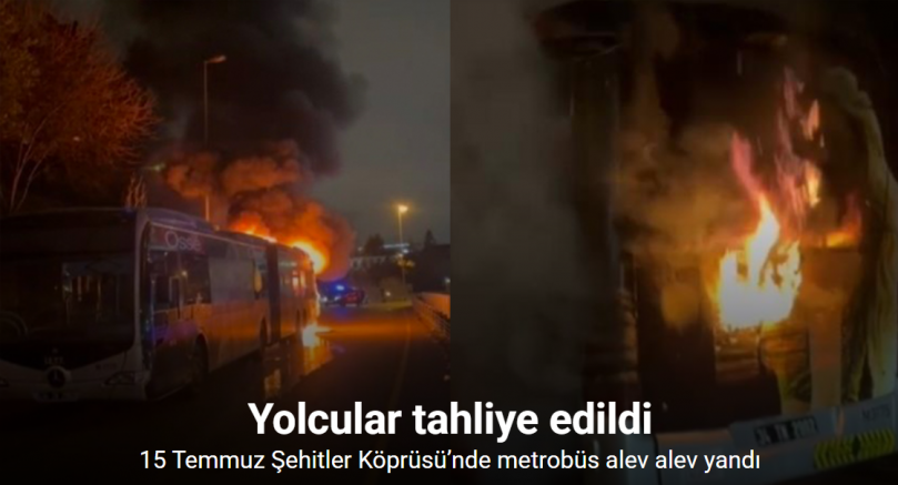 Yangın, 00.15 sıralarında 15 Temmuz Şehitler Köprüsü bağlantı yolu üzerinde meydana geldi. Edinilen bilgiye göre seyir halindeki metrobüsün motor kısmında henüz bilinmeyen bir sebeple yangın çıktı. Alevlerin fark eden sürücü aracı sağa çekerek kendini dışarı attı. Metrobüsün içinde seyahat eden 60 kişi tahliye edildi. İhbar üzerine olay yerine çok sayıda itfaiye, sağlık ve polis ekibi sevk edildi. İtfaiye ekipleri yangına müdahale ederken polis ekipleri yolda güvenlik önlemi aldı. İtfaiye ekiplerinin müdahalesi sonucu yangın tamamen söndürüldü. Bölgede yangın sebebiyle trafik meydana geldi. Tahliye edilen yolcular başka bir metrobüse transfer edildi. Yangın sebebiyle kullanılamaz hale gelen metrobüsün bulunduğu yerden kaldırılması sonrası trafik akışı normale döndü.