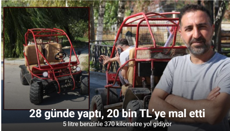 Eskişehir’de yaşayan 38 yaşındaki Fırat Eyüpoğlu bir araç yapmak için karar aldı. Bu kararı sonrası ön çalışma ve planlama yapan Eyüpoğlu, hurdacılardan topladığı malzemelerle 28 gibi kısa bir sürede aracını yaptı. İki kişilik ve otomatik vites olan 360 kilogram ağırlığındaki araç, 800 kilogram ağırlıkla 370 kilometreyi 5 litre benzinle kat etmeyi başardı. Motoru dahil tüm parçalarını hurdacıdan toplayan Fırat Eyüpoğlu, aracını toplamda 20 bin TL’ye mal etti. Aracını hem asfaltta hem de arazide gidebilecek şekilde tasarlayan Eyüpoğlu, onunla kampa gitmeyi planlıyor. Aracının oldukça dikkat çektiğini belirten Eyüpoğlu, 300 ile 400 bin TL bandında gelen teklifleri ise düşünmeden reddettiğini belirtti.