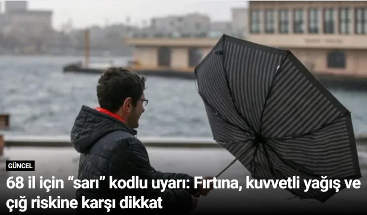Meteoroloji Genel Müdürlüğü (MGM), yurdun büyük bölümünde etkili olması beklenen olumsuz hava koşulları nedeniyle 68 il için “sarı” kodlu uyarı yayımladı. Uyarıda; fırtına, kuvvetli yağış ve yüksek kesimlerde çığ riskine karşı vatandaşların dikkatli ve tedbirli olması istendi.