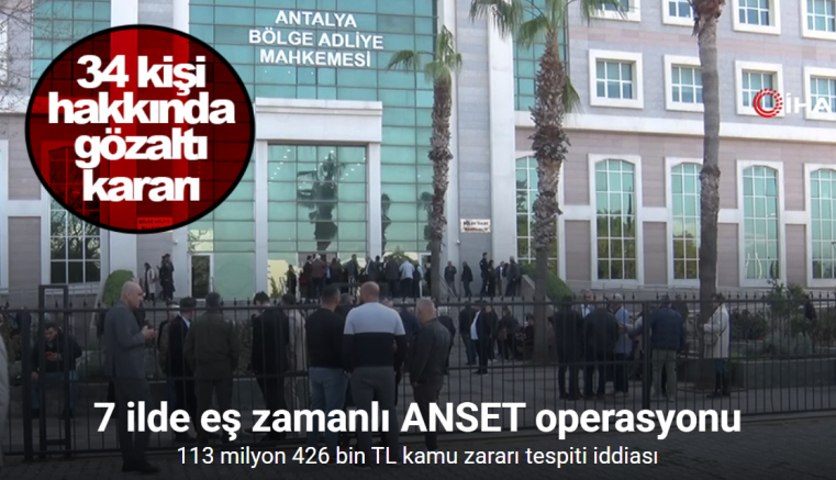 Şüphelilerin yakalanması ve suç unsurlarının ele geçirilmesine yönelik 30 Nisan 2026 tarihinde Antalya merkezli olmak üzere İstanbul, Ankara, İzmir, Muğla, Denizli ve Edirne’de eş zamanlı operasyon düzenlendi. Operasyon kapsamında haklarında gözaltı kararı verilen 34 kişiden 29’u yakalandı. Yakalanan 29 kişinin 2’sinin cezaevinde olduğu operasyonda, şüphelilerden 2’sinin yurt dışında olduğu tespit edilirken, 3 kişi hakkında yakalama çalışmalarının sürdüğü öğrenildi. Mülkiye Başmüfettişi tarafından hazırlanan tevdi raporu ve emniyet birimlerince yapılan araştırmalar doğrultusunda, Antalya Büyükşehir Belediyesi iştiraki ANSET tarafından gerçekleştirilen ihalelerde usulsüzlük tespit edildiği öğrenildi. Soruşturma kapsamında, ihalelerde yetkili olan kişiler ile aralarında suçtan elde edilen geliri aklama amacıyla para geçişleri tespit edilen şüpheliler hakkında işlem başlatılırken, dosyada, 113 milyon 426 bin TL kamu zararı tespit edildiği bildirildi.
