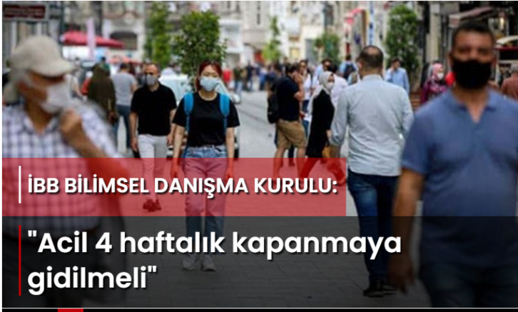 Tek çözüm olarak acil olarak.Pandemi kaynaklı ölümlerle vaka sayılarının kaygı verici seviyeye ulaşmasının ardından İBB Bilimsel Danışma Kurulu, acilen alınması gereken tedbirleri açıkladı. 6 başlıkta sıralanan tedbirler arasında; dört haftalık kapanma, aşılanma sürecinde hızlanma, test sayısının arttırılması, izolasyon olanakları sağlanması, karantina ve seyahat kısıtlaması, yoksul halka maske temini ve kalite kontrolü ile sağlık çalışanlarına destek yer aldı.