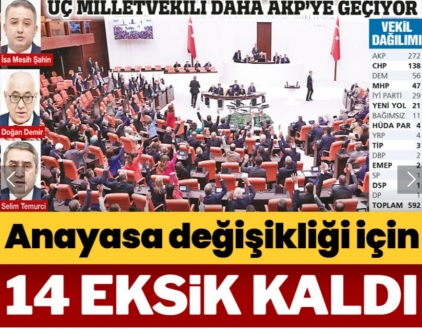 Anayasa’yı referandumsuz değiştirmek için gerekli olan 400 oy sayısında 14 eksik kalıyor. Ancak AKP’li TBMM Başkanı oy kullanamadığı için 15 vekile ihtiyaç bulunuyor.