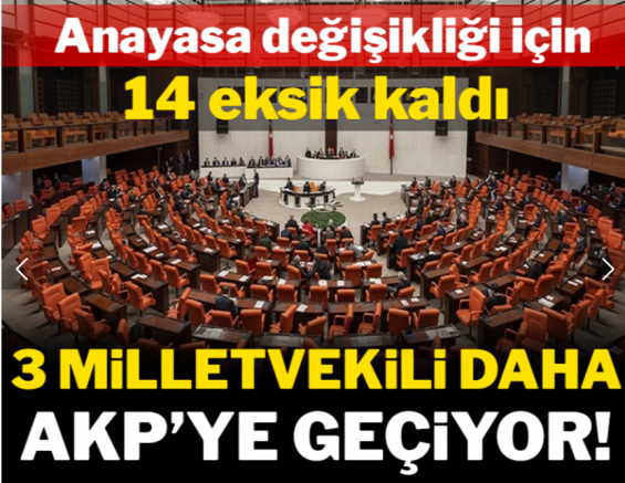 Anayasa’yı referandumsuz değiştirmek için gerekli olan 400 oy sayısında 14 eksik kalıyor. Ancak AKP’li TBMM Başkanı oy kullanamadığı için 15 vekile ihtiyaç bulunuyor.