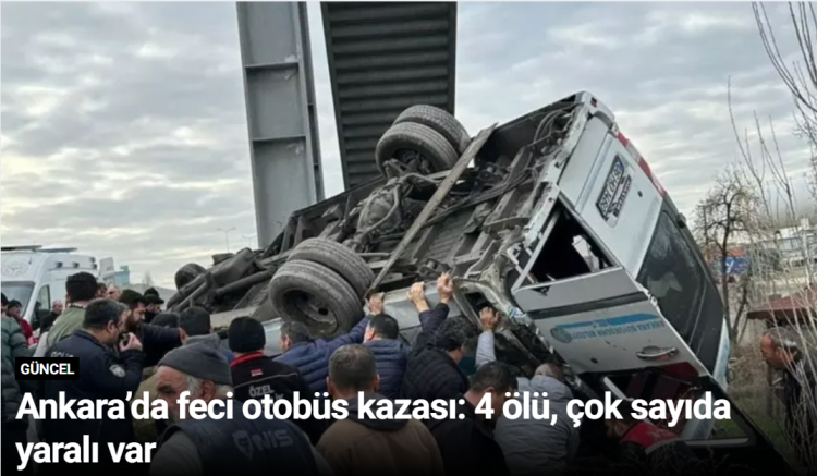 Son dakika haberine göre Ankara-İstanbul kara yolunun Kahramankazan ilçesi Saray mevkiinde halk otobüsünün üst geçide çarpması sonucu feci bir kaza meydana geldi. İlk belirlemelere göre kazada 4 kişi hayatını kaybederken 13 kişi yaralandı.