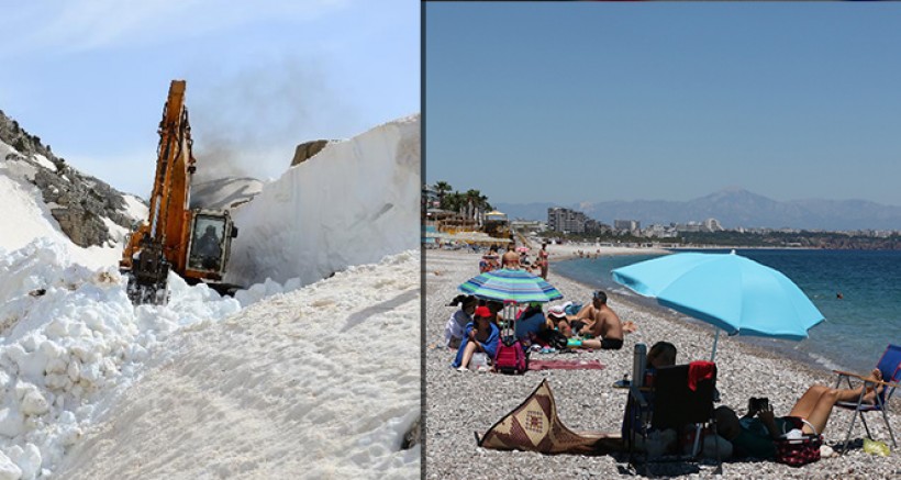 urizmin başkenti Antalya'da iki farklı mevsimin görüntüsü bir arada çekildi. Antalya Büyükşehir Belediyesi, Akseki'nin 2 bin 500 metre rakımlı Göktepe ve Gündoğmuş ilçesinin 2 bin metre rakımlı Söbüçimen yaylalarında yer yer 2-5 metreyi bulan karla kaplı yolları göçerlerin ulaşımına açmak için çalışıyor. Ekipler, Akseki, Manavgat ve Gündoğmuş'ta özellikle hayvancılıkla uğraşan vatandaşların yazın mera olarak kullandığı Göktepe ve Söbüçimen Yayla yollarını açmak için çalışma yaptı. Yaklaşık 15 gün süren çalışmalar ise tamamlanarak göçerlerin yaylaya çıkması için çalışmalar tamamlandı.