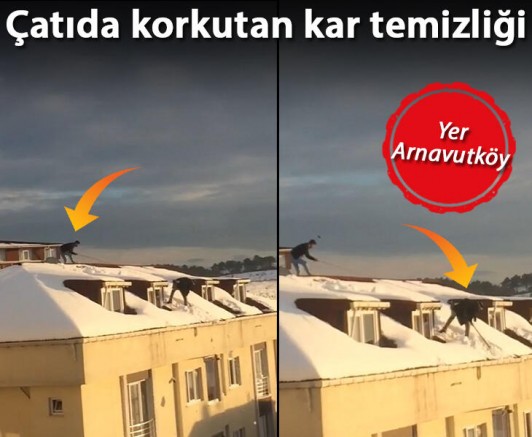 Kar yağışının ardından İstanbul'da binaların çatılarında temizlik çalışması yapanlar tehlikeli anların ortaya çıkmasına sebep oluyor. Kar yağışının en yoğun yaşandığı ilçelerden biri olan Arnavutköy'de vatandaşların hiçbir güvenlik önemli almadan bina çatılarında kar temizliği yapması görenleri şaşkına çevirdi. Arnavutköy Merkez Mahallesi'nde 5 katlı binanın çatısını temizleyen 2 kişiyi görenler o anları cep telefonu kamerasıyla görüntülendi. Çatının ön bölümüne kadar gelen kişinin beline bağladığı ipi arkada bulunan kişi tutarak önlem alması dikkat çekti.