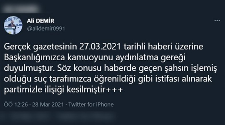 AKP Aydın İl Gençlik Kolları Başkanı Ali Demir, olayın gündeme gelmesinin hemen ardından gece saatlerinde sosyal medya hesabından açıklama yaptı. AKP’li Demir, sosyal medya hesabından yaptığı açıklamada, yaşananları doğrulayarak şu ifadeleri kullandı: