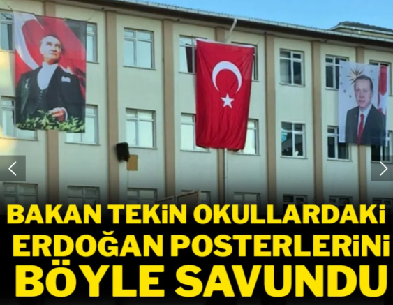 Tekin, Cumhurbaşkanı Erdoğan'ın posterinin Atatürk ve Türk bayrağı ile birlikte okullarda görünür olmasının cumhuriyet değerlerini geleceğe taşımak adına bir ödev ve aynı zamanda Anayasa'nın 104'üncü maddesi kapsamında hukuki bir zorunluluk olduğunu söyledi.