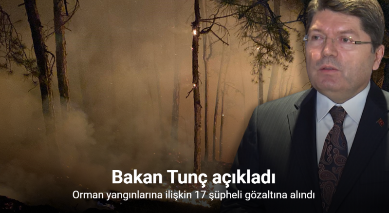 Adalet Bakanı Yılmaz Tunç, sosyal medya hesabından son zamanda yaşanılan yangınlar ile ilgili paylaşımda bulundu. Tunç, yangınlar sorası Cumhuriyet Başsavcılıkları tarafından yürütülen adli soruşturmalar sonucu 17 şüphelinin gözaltına alındığını açıkladı.