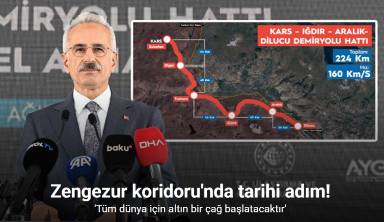 Zengezur Koridoru’nun, önemli bir parçası olacak Kars-Iğdır-Aralık-Dilucu Demir Yolu Hattı’nda temeli bugün Ulaştırma ve Altyapı Bakanı Abdulkadir Uraloğlu’nun katıldığı törenle atıldı. Cumhurbaşkanı Recep Tayyip Erdoğan tören kapsamında yazılı bir mesaj yayımladı. Cumhurbaşkanı Erdoğan, Kars-Iğdır-Aralık-Dilucu Demiryolu Hattı’nın Türkiye ve bölge için hayırlara vesile olmasını temenni etti. Türkiye ile Azerbaycan arasındaki yeni ulaşım bağlantısını sağlayacak olan bu hattın, Türkiye ile Nahçıvan ve Azerbaycan arasında köprü vazifesi görecek çok önemli bir kalkınma hamlesi olduğunu dile getirerek, açıklamasında şu ifadelere yer verdi: "Proje büyüklüğü 2,4 milyar Avro, toplam uzunluğu 224 kilometre olan yeni demiryolu hattımız; 5 istasyon, 5 tünel, 19 aç-kapa tünel, 10 köprü, 3 viyadük, 144 altgeçit, 27 üstgeçit ve 480 menfezden oluşuyor. Zengezur geçişi Demiryolu Hattı üzerinden Azerbaycan ile Güneydoğu ve Akdeniz bölgelerimizi; Hazar ile Akdeniz havzasını birleştirecek Kars-Iğdır-Aralık-Dilucu Demiryolu Hattımızın tamamlanması, bölgesel iş birliği ve kalkınmaya çok güçlü bir ivme kazandıracaktır."
