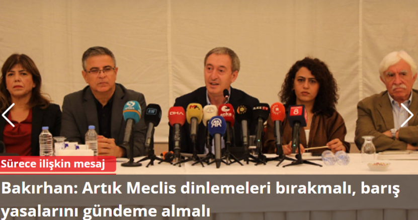 "Artık Meclis dinlemeleri bırakmalı, barış yasalarını gündemle almalı" diyen Bakırhan, "Barış yasalarını hayata geçirecek kanunlar çıkarmalıdır. Geldiğimiz nokta biraz odur. Meclis demokratik entegrasyonun tam olarak başarıya ulaşması için de yasalar geçirerek bunun altyapısını oluşturmalıdır. Ekim ayında Meclis'in açılışıyla birlikte tam da başkanın (Baro Başkanı) söylediği gibi en başta geçiş yasaları olmak üzere Terörle Mücadele Kanunu, Türk Ceza Kanunu, Ceza Mahkemeleri Usul Kanunu gibi temel yasalar, yerel yönetimlerin güçlendirilmesi, infaz kanunu, tutuksuz yargılamayı keyfilikten çıkaracak yasal düzenlemeleri hızlı bir şekilde gündemine almalı ve bunları Meclis'ten geçirmelidir. Çünkü bunlar toplumun genel talepleridir ve beklentileridir" ifadelerini kullandı.