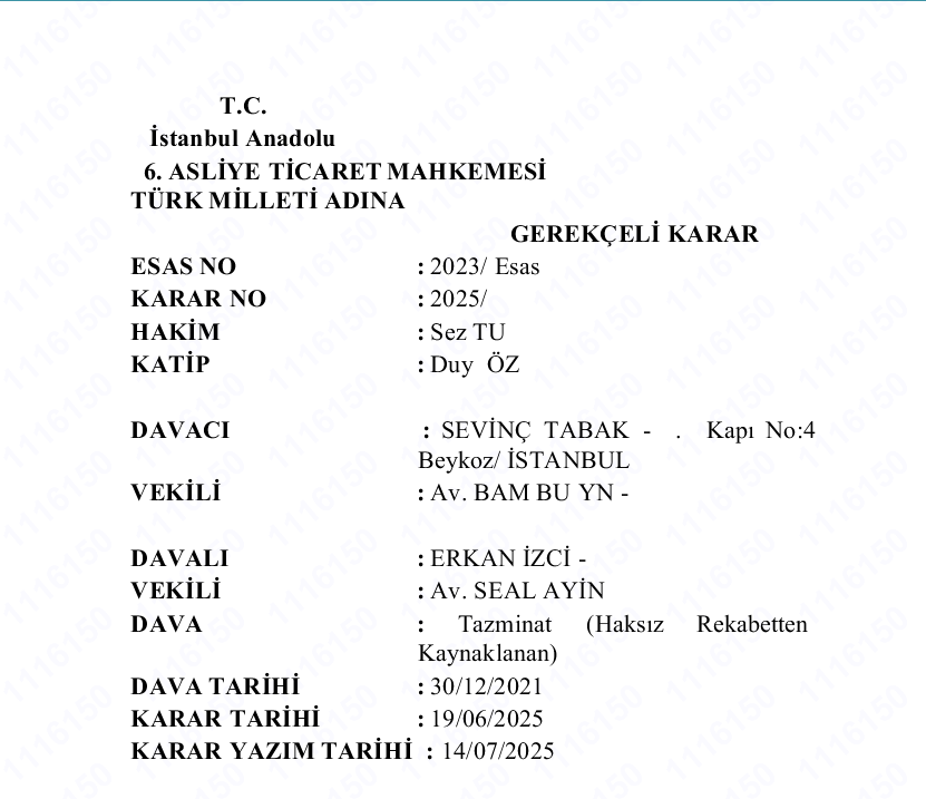 Türkiye Cumhuriyeti Anayasası’nın 9. maddesine göre Türk Milleti adına yargılama yetkisini kullanan bağımsız İstanbul Anadolu 6. Asliye Ticaret Mahkemesince, tarafça açılan dava üzerine yapılan yargılama nihayetinde;