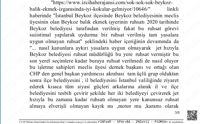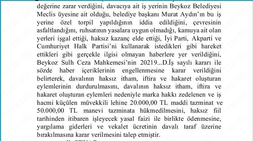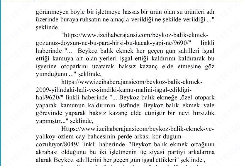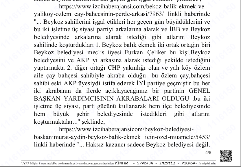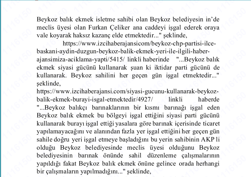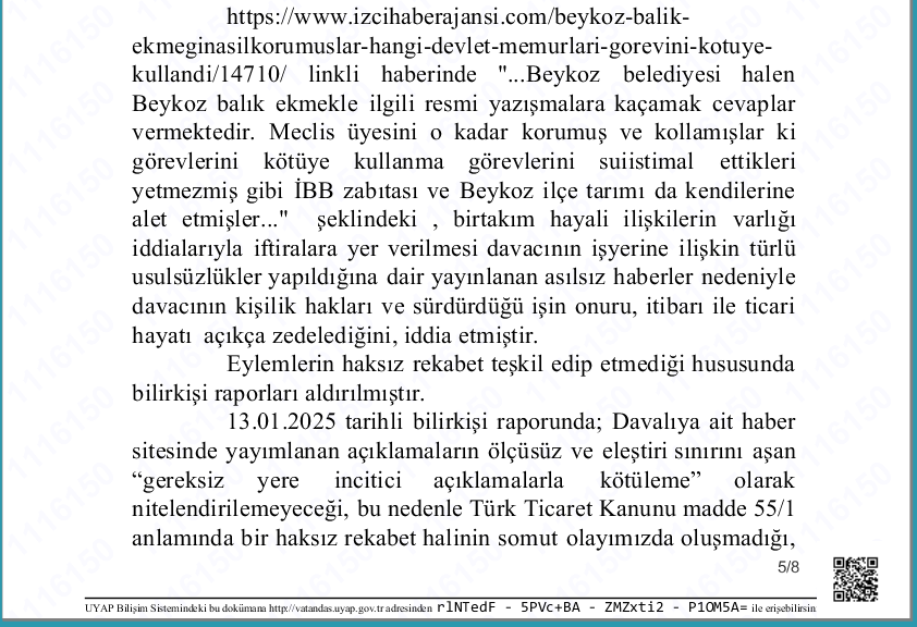 https://www.izcihaberajansi.com/beykoz-balik-ekmeginasilkorumuslar-hangi-devlet-memurlari-gorevini-kotuye-kullandi/14710/ linkli haberinde "...Beykoz belediyesi halen Beykoz balık ekmekle ilgili resmi yazışmalara kaçamak cevaplar vermektedir. Meclis üyesini o kadar korumuş ve kollamışlar ki görevlerini kötüye kullanma görevlerini suiistimal ettikleri yetmezmiş gibi İBB zabıtası ve Beykoz ilçe tarımı da kendilerine alet etmişler..." şeklindeki , birtakım hayali ilişkilerin varlığı iddialarıyla iftiralara yer verilmesi davacının işyerine ilişkin türlü usulsüzlükler yapıldığına dair yayınlanan asılsız haberler nedeniyle davacının kişilik hakları ve sürdürdüğü işin onuru, itibarı ile ticari hayatı açıkça zedelediğini, iddia etmiştir.