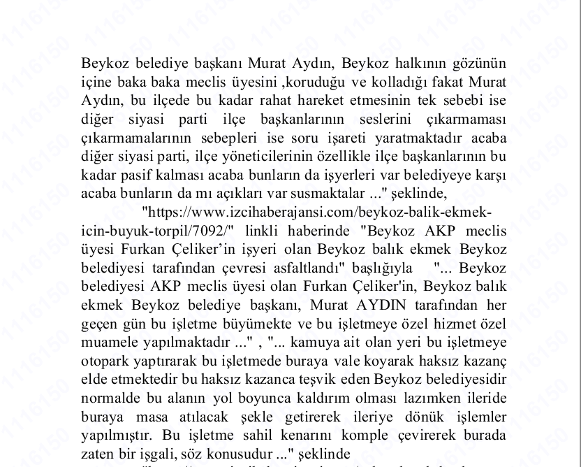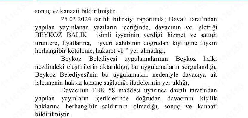 Beykoz Belediyesi uygulamalarının Beykoz halkı nezdindeki eleştirilerin aktarıldığı, bu uygulamaların sorgulandığı, Beykoz Belediyesi'nin bu uygulamaları nedeniyle davacıya ait işletmenin haksız kazanç sağladığı ifadelerinin yer aldığı,