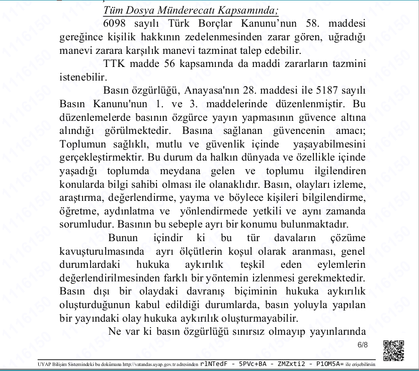Davacının TBK 58 maddesi uyarınca davalı tarafından yapılan yayınların içeriklerinde doğrudan davacının kişilik haklarına herhangibir saldırının olmadığı, sonuç ve kanaati bildirilmiştir.