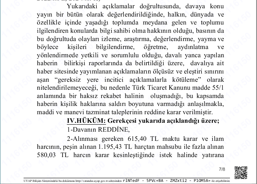 Yukarıdaki açıklamalar doğrultusunda, davaya konu yayın bir bütün olarak değerlendirildiğinde, halkın, dünyada ve özellikle içinde yaşadığı toplumda meydana gelen ve toplumu ilgilendiren konularda bilgi sahibi olma hakkının olduğu, basının da bu doğrultuda olayları izleme, araştırma, değerlendirme, yayma ve böylece kişileri bilgilendirme, öğretme, aydınlatma ve yönlendirmede yetkili ve sorumlulu olduğu, davalı yanca yapılan haberin bilirkişi raporlarında da belirtildiği üzere, davalıya ait haber sitesinde yayımlanan açıklamaların ölçüsüz ve eleştiri sınırını aşan “gereksiz yere incitici açıklamalarla kötüleme” olarak nitelendirilemeyeceği, bu nedenle Türk Ticaret Kanunu madde 55/1 anlamında bir haksız rekabet halinin oluşmadığı, bu kapsamda haberin kişilik haklarına saldırı boyutuna varmadığı anlaşılmakla, maddi ve manevi tazminat taleplerinin reddine karar verilmiştir.