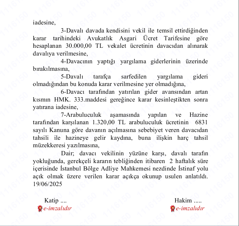 Dair; davacı vekilinin yüzüne karşı, davalı tarafın yokluğunda, gerekçeli kararın tebliğinden itibaren 2 haftalık süre içerisinde İstanbul Bölge Adliye Mahkemesi nezdinde İstinaf yolu açık olmak üzere verilen karar açıkça okunup usulen anlatıldı. 19/06/2025