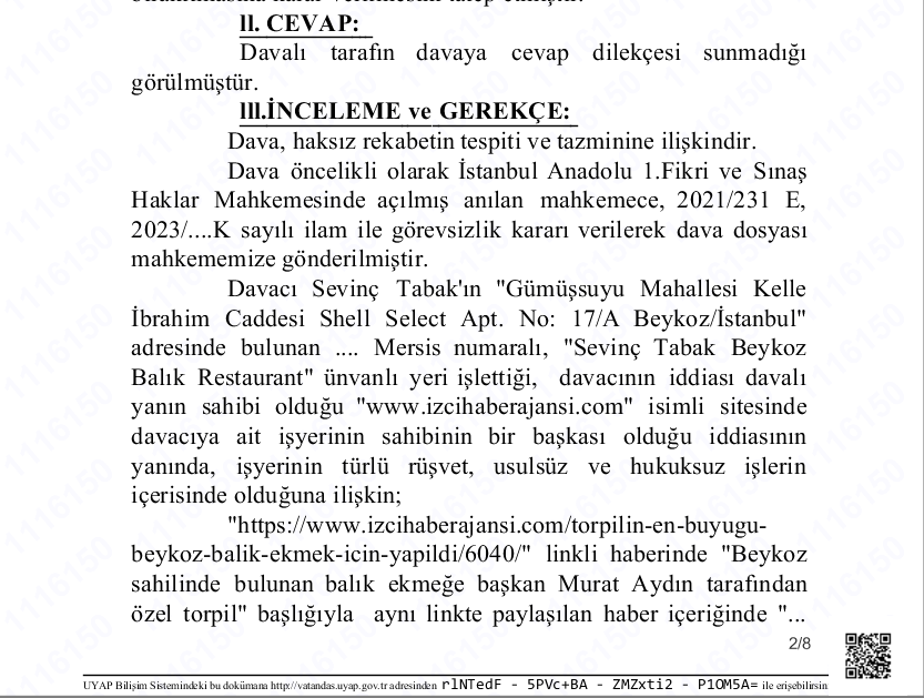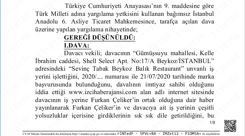 Davacı Sevinç Tabak'ın "Gümüşsuyu Mahallesi Kelle İbrahim Caddesi ShellApt. No: 17/A Beykoz/İstanbul" adresinde bulunan .... Mersis numaralı, "Sevinç Tabak Beykoz Balık Restaurant" ünvanlı yeri işlettiği, davacının iddiası davalı yanın sahibi olduğu "www.izcihaberajansi.com" isimli sitesinde davacıya ait işyerinin sahibinin bir başkası olduğu iddiasının yanında, işyerinin türlü rüşvet, usulsüz ve hukuksuz işlerin içerisinde olduğuna ilişkin;