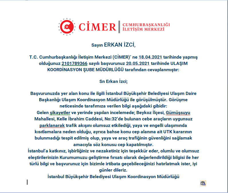 Gümüşsuyu Mahallesi Kelle İbrahim Caddesi üzerinde; Su Ürünleri Beykoz Balıkçı Barınağı önündeki otobüs durağına ait cebin; otoparka çevrilerek değnekçilik yapılması ve haksız kazanç elde edilmesi hakkında şikâyet ve suç duyurusu.