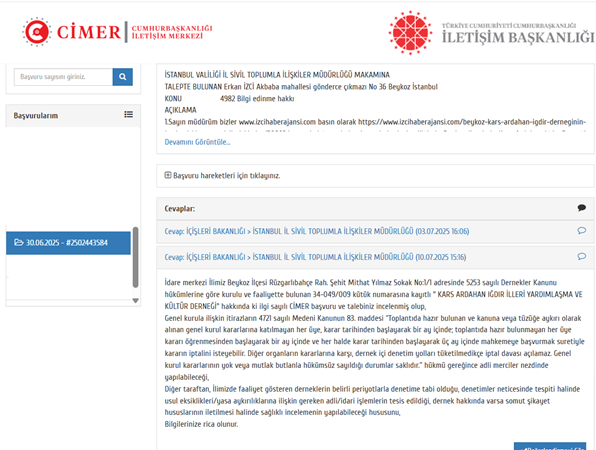 CİMER yoluyla 4982 bilgi edinme kanunu kapsamında ilgili makamlara yazışmalarımızı yapmışızdır gelen cevaplar neticesinde haberimizin içeriliğinde gelen cevapta derneğin açık adresi yazılmaktadır fakat izci haber ajansı bizzat dernekler masasına kayıtlı olan açık adrese gittiğimizde karşımıza bir ev çıktığı ev sakinleri de böyle bir derneği tanımadıklarını söylemişlerdir. Haber ajansımız daha sonra detaylı araştırma yaptığımızda yıllardır hayalet derneğin başında çantada dernek başında derneği bir adım ileri götüremeyen yıllardır derneğin başında olan dernek binası olmayan bırak dernek binasını derneğin açık adresi olmayan dernekler masasında açık adresini güncelleyemeyen bu başkan Kars Ardahan Iğdır dernek başkanı Esengül Yılmaz Gül bakın derneği bir adım ileri götüremeyen bu başkan Beykoz CHP meclis üyesi şimdi soruyoruz dernek başkanlığında başarılı olamayan bir üyesinin yarasına merhem olamayan derneği bir adım ileri götüremeyen yıllardır derneğin başkanlığını yapan yıllardır başkanlık yaptığı halde bir dernek binası olmayan derneğin tabelası olmayan derneğin açık adresi olmayan bu dernek başkanı CHP’de meclis üyeliğinde halka nasıl hizmet verebilir burada Kars Ardahan Iğdır üyelerine sesleniyoruz. Bu derneğin açık adresi yok, binası yok ilgili makamlardan gelen yazışmalarda açık net görünmekte ilgili makamlarla yapmış olduğumuz telefon görüşmelerinde de derneğin açık adresinin güncellenmediğini söylenmiştir gelen ihbarlarda da bu meclis üyesinin adresi bizde saklı mesire alanının olduğunu bu yerin araştırmamızı istediklerini ısrarla gelen ihbarlarda söylenmektedir. Bizde izci haber ajansı olarak gelen ihbar kimin adına gelirse gelsin değerlendiririz ve ilgili makamlarla yazışmalarımızı yaparız gelen cevaplar neticesinde şayet haber konusu ise hiç kimseden korkmadan çekinmeden haberlerini yayınlarız bu ihbarlar konusu ile ilgilide ilgili makamlara yazışmalarımızı yapacağımızı hatırlatırız bir hatırlamada Beykoz genelinde STK’lara diyoruz senede 10 gün belediyenin etkinliğinde kendinizi göstermeyin her zaman sahada olun STK belediyeden daha söz sahibidir sakın bunu unutmayın.