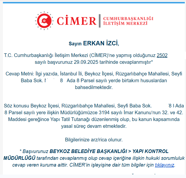 Yayınladığımız haberlerden sonra ve ilgili makamlara yaptığımız müracaatlardan sonra BEYKOZ BELEDİYE BAŞKANLIĞI > YAPI KONTROL MÜDÜRLÜĞÜ tarafından gelen cevapta şunu söylemektedir: İstanbul İli, Beykoz İlçesi, Rüzgarlıbahçe Mahallesi, Seyfi Baba Sok 8 Ada 8 Parsel sayılı yerde birtakım hususlardan bahsedilmektedir.