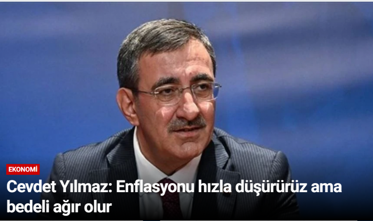 Cumhurbaşkanı Yardımcısı Cevdet Yılmaz, ekonomi gazetecileriyle İstanbul Finans Merkezi’nde düzenlenen toplantıda, enflasyonla mücadelede izlenen politikanın bilinçli bir tercih olduğunu belirterek, hızlı düşüşün ciddi sosyal ve ekonomik maliyetler yaratabileceğine dikkat çekti. Yılmaz, hükümetin bu nedenle kademeli ve dengeli bir dezenflasyon sürecini sürdürdüğünü vurguladı.