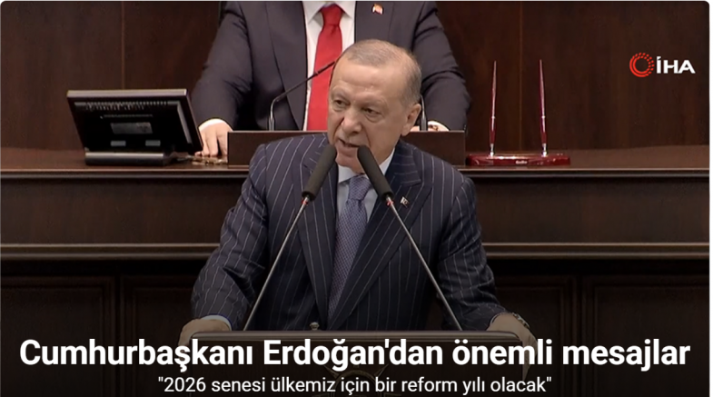 Yeni yılın Türkiye için bir reform yılı olacağına vurgu yapan Erdoğan, "Türkiye Yüzyılı Reform Programımızı Keclisimizin de desteğiyle inşallah hayata geçireceğiz. Bunun dışında çocuklarımızın dijital tehditlerden korunmasından sosyal yardım sistemimizin yeniden gözden geçirilmesine kadar geniş bir yelpazede insanımızın hayatına dokunan reformları milletimizle buluşturacağız. Dünyanın ve bölgemizin hangi ciddi tehditlerle yüzleştiğini hepimiz takip ediyoruz. Küresel ekonomi, değerli metaller üzerinden yürüyeceği ve çok can yakacağı anlaşılan yeni bir muharebenin hızla içine sürükleniyor. Enerji kaynaklarını elde etme uğruna. ticaret yollarını elde etme uğruna yeni bir paylaşım rekabetinin hem de çok agresif bir şekilde yaşanacağı görülüyor. Batı dünyası yıllardır başka ülkeleri tehdit etmek için kullandığı tüm argümanlarını tek tek kaybediyor. Masada olmayanın menüye konulduğu acımasız bir bölüşüm kavgasının tam ortasındayız. Dalga boyu artan bu küresel fırtınadan Türkiye'yi sahil-i selamete ulaştıracak olan kadro bellidir, bu kadronun adı da AK Parti ve Cumhur İttifakı'dır. Güçlü Türkiye'nin güvencesi güçlü bir AK Parti, güçlü bir Cumhur İttifakı'dır. Emperyalist oyunları bozacak olan irade, tecrübe ve cesaret işte bu kadroda, bu ittifakta ziyadesiyle mevcuttur" ifadelerine yer verdi.