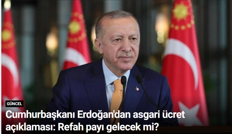 Son günlerde kamuoyunda, açıklanan asgari ücrete ilave refah payı eklenip eklenmeyeceği tartışılırken, Erdoğan’ın konuşmasında bu konuya değinmemesi dikkat çekti. Bu durum, asgari ücrete ek bir artış yapılmayacağı şeklinde değerlendirildi.