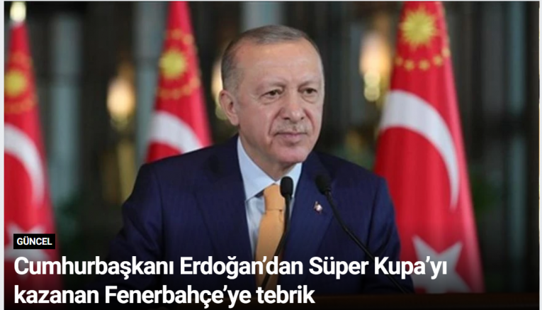 Cumhurbaşkanı Recep Tayyip Erdoğan, 2025 Turkcell Süper Kupa finalinde Galatasaray’ı 2-0 mağlup ederek şampiyonluğa ulaşan Fenerbahçe’yi tebrik etti.