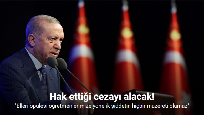 Konuşmasının başında Çekmeköy’de öğrencisi tarafından bıçaklanarak ağır yaralanan ve kaldırıldığı hastanede hayatını kaybeden öğretmen Fatma Nur Çelik’e değinen Erdoğan, "Sözlerimin hemen başında dün İstanbul Çekmeköy’de bir lisede uğradığı menfur saldırıda vefat eden Fatma Nur Çelik öğretmenimize Rabbimden gani gani rahmet diliyorum. Merhum öğretmenimizin ailesi ve yakınlarına sabır, büyük bir fedakarlıkla ülkemize hizmet eden eğitim camiamıza başsağlığı temenni ediyorum. Elleri öpülesi öğretmenlerimize yönelik şiddetin hiçbir gerekçesi, hiçbir mazereti olamaz. Bırakın şiddeti, Hazreti Ali Efendimizin ’bana bir harf öğretenin kırk yıl kölesi olurum’ buyurduğu öğretmene, hocaya yönelik saygısızlık etmek bile inancımızda ve kültürümüzde kabul edilmez bir davranıştır. Başsavcılığımız adli, bakanlığımız idari soruşturmayı başlatmıştır. Milletçe hepimizi hüzne boğan bu olayın üzerine kararlılıkla gidilecek, failin hak ettiği cezayı alması için gereken mutlaka yapılacaktır. Aynı saldırıda yaralanan öğretmenimize ve öğrencimize de yüce Allah’tan acil şifalar diliyorum. Rabbim Fatma Nur öğretmenimizin mekanını inşallah cennet eylesin" ifadelerini kullandı.