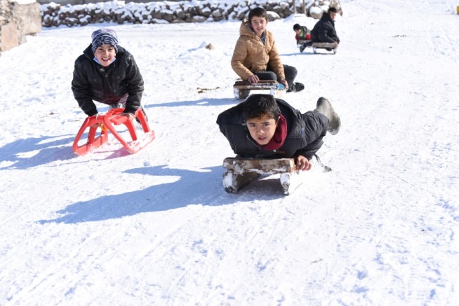 Bir süredir etkili olan yağışlarla kar kalınlığının 10 santimetreye ulaştığı kentte, çocuklar kızak kayarak keyifli zaman geçirdi.