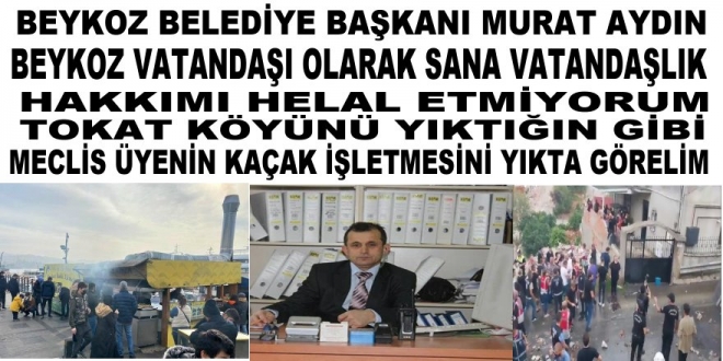 Başkan Murat Aydın Beykoz halkına o kadar takıntılı ki son günlerde yerel basınlarda ve ulusal basında tokat köyde bulunan kentsel dönüşümle ilgili Murat Aydının yürütme durdurma kararı olduğu halde buradaki vatandaşları perişan etmiş etmeye de devam ediyor. Bugün yarın aynı tokat köye uyguladığını çubukluda bulunan kentsel dönüşümde tokat köy halkına yaptığını burada da aynısını yapacaktır sadece bu değil Beykoz çayırını millet bahçesi projesi uygulayarak bir proje çizerek bu proje çevresinde ki evleri ve esnafları da aynı tokat köy halkına yapmış olduklarını burada da uygulayacak peki Murat Aydın sen vatandaşların evlerini sabah ezanında erkeği pijamalı kadını gecelikli halde ayağa dikerek yıkımlar gerçekleştirdin Poyraz ve Riva plajlarında çok sayıda esnafları ekmeklerinden ettin tokat köyünde bu kadar insanları mağdur ettin okuyan çocukları okullarından ettin, okuyan çocukların hayallerinden ettin, tokat köy halkını elektriksiz, susuz, doğalgazsız bıraktın elektriğe bağlı olan hastaları mağdur ettin say say bitmez peki. Murat Aydın bunları yaptın bu kadar kuvvetli bir başkansan yumruğunu masaya vurduğunda masayı titretiyorsan haktan hukuktan bahsediyorsunuz camilere gidip beş vakit namaz kılıyorsunuz cenazelere gidip ön safta namaz kılıyorsunuz Müslümanız diyorsunuz hadi .Murat Aydın adaletten haktan hukuktan bahsediyorsan Müslümansan şeffaf bir belediye başkanlığı yapıyorum diyorsan meclis üyen Furkan Çeliker'in kaçak işletmesini yık da görelim gece yarıları sabah karşı halkın evini yıkıyorsun plajları yıkıyorsun tokat köy halkın evlerini yıkıyorsun hadi meclis üyenin kaçak işletmesini yık da görelim yıkamazsın sende o cesaret yok sende öyle hak hukuk adalet yok.