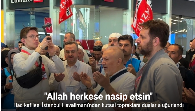 Hacı adayları, ibadetlerini yerine getirmek üzere Suudi Arabistan’a gitmek için İstanbul Havalimanı’nda bir araya geldi. Diyanet İşleri Başkanlığı ekipleri eşliğinde gerçekleştirilen uğurlama programında dualar okundu, kafile kutsal topraklara doğru yola çıktı.