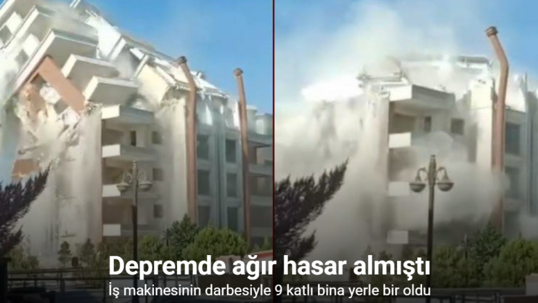 Kahramanmaraş merkezli depremlerde ağır hasar alan Hatay’da mahkeme süreci sona eren binaların yıkım ve enkaz kaldırma çalışmaları aralıksız sürüyor. Kırıkhan ilçesi Mimar Sinan Mahallesi’nde bulunan 9 katlı bina, iş makinesiyle kontrollü olarak yerle bir oldu. Binanın yıkıldığı anlar ise kameraya yansıdı. 9 katlı binanın yıkımı esnasında herhangi bir olumsuzluk yaşanmadı.