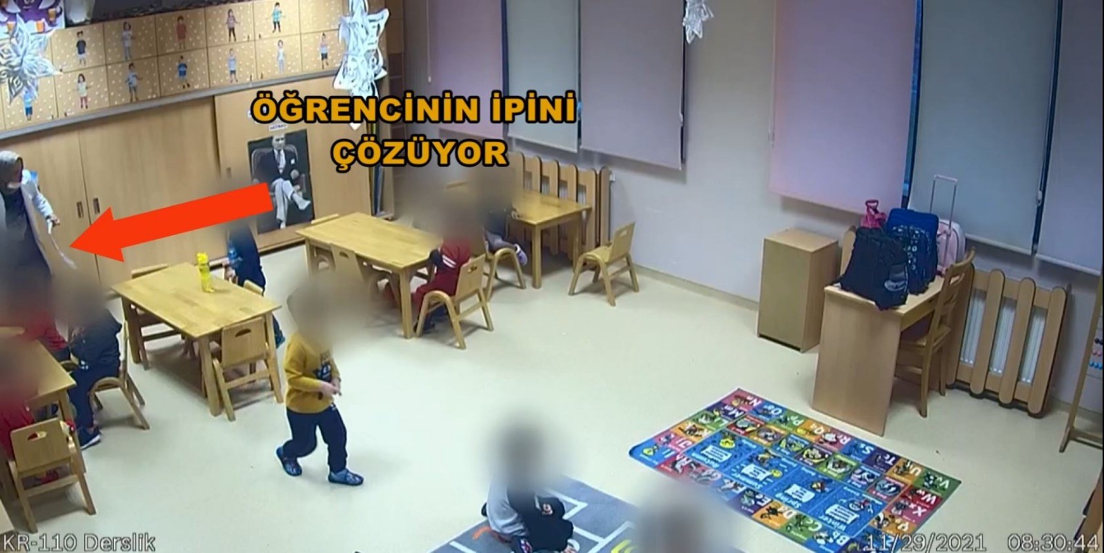 Kameraya yansıyan görüntülerde öğretmenlerin, 10 Kasım'da çocuklarla hazırladıkları Atatürk'ü anma programında çocukların fotoğrafını çekerken, bir taraftan da bağladıkları çocuğun fotoğrafını çekerek anneye atmaları dikkatlerden kaçmadı.