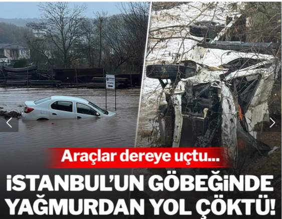 İstanbul'un Sarıyer İlçesi Uskumruköy'de kuvvetli yağış nedeniyle yolun çökmesi sonucu pikap ile kamyonet dereye düştü. Sele kapılan bir araç da kanala düştü.