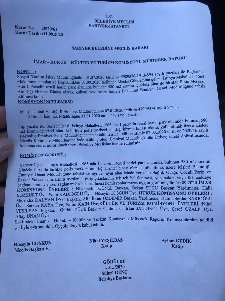 Sarıyer belediye başkanı Şükrü Genç İstinye mahallesinde park alanı, muhtarlık binasını Sarıyer belediye meclisince polis karakolu olarak verilmiş . Karakola girişi Sağlık ocağından ayrı tutmak için ağaçlar gözden çıkarılabilir. İstinye halkı bu duruma tepkili ve imza toplamaktadır. Sarıyer belediye meclisinde ,AKP li oyları bu alanın korunması yönündeyken , belediye başkan yardımcımız Hüseyin Coşkun ve meclis üyelerinin, çoğunluğu evet oyu kullanarak bombayı kucağına almıştır. Tek parkımız ve afet toplanma alanlarından biri olan bu park İstinye halkı için çok değerlidir. Muhtar Recep Alkan’ın elektriği, bile kesilmiş, kendi üzerine elektrik sözleşmesi yapmak zorunda kalmıştır. İstinye halkı Muhtarımız, yanındayız demekteler parkımızı ve ağaçlarımızı koruyacağız. Haber ajansımıza gelen ihbarlar ve halkın mesajları ortak nokta da bu şekildedir yapmış olduğumuz araştırmada belediyenin meclisinde alınan kararda 1565 ada 1 parsel ,bulunan tapuda muhtarlık binası sağlık ocağı, tapu içsesinde kalmadığı haberimizin tapu krokisinde açık net görünmektedir bu haberimizin daha detaylı olarak ileriki günlerde, tüm somut delilleri toplayarak haber ajansımızda yayınlanacaktır bu konuyla ilgili olarak başkanı aradığımızda basın danışmanına yönlendirdiğini bizler izcihaberajansi.com olarak böyle hassas bir haber konusunun muhatabı basın danışmanı değildir bizler izcihaberajansi.com olarak başkan Şükrü Gençten bu konuyla ilgili görüşlerini beklemekteyiz