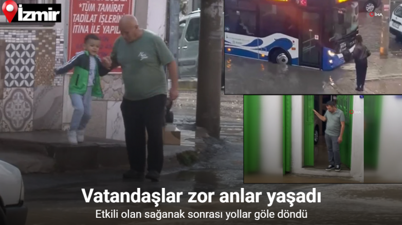 Bornova Mevlana Mahallesi’nde sabah saatlerinde etkili olan sel nedeniyle belediye otobüsüne binmekte zorlanan bir kadına şoför yardım etti. Şoför, otobüsü kaldırıma yanaştırarak kadının güvenle araca binmesini sağladı. Ayrıca yolun karşısına geçmek isteyen bir kedi ise su birikintisine girdi ancak yüzerek geri çıktı.