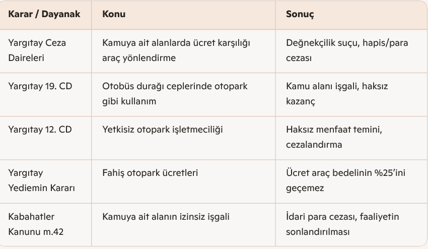 • Yargıtay 19. Ceza Dairesi kararlarında, belediyeye veya kamuya ait alanlarda “otopark işletmeciliği” görüntüsü altında yapılan faaliyetlerin “kamusal alanın işgali” ve “haksız kazanç” olarak değerlendirilmesi gerektiği belirtilmiştir.
