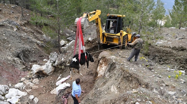 Şefik Kılıç, Konyaaltı Belediye Başkanı Semih Esen'i arayarak yardım istedi. Başkan Esen'in talimatıyla belediyeye ait bir kepçe, ineğin düştüğü bölgeye gitti. Kepçeyle yol açan operatör, 1 saatlik çalışmayla hayvanın bulunduğu bölgeye ulaştı. Operatör, ineği halat yardımıyla düştüğü çukurdan çıkardı, Kılıç ailesinin evine kadar götürdü.