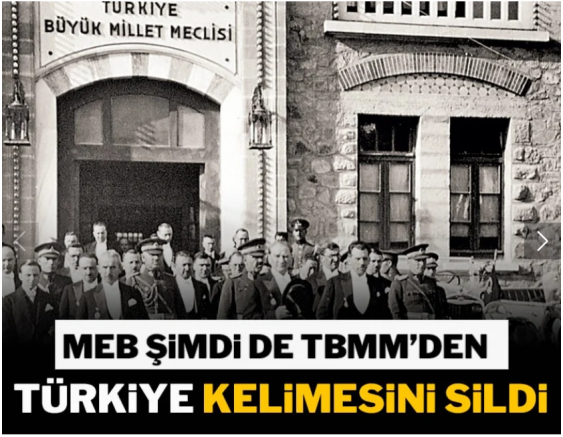 10, 11 ve 12. sınıf öğrencilerine üniversite sınavında sorulacak İnkılap Tarihi ve Atatürkçülük dersi konu başlıkları ve kazanımlarında, Türkiye Büyük Millet Meclisi’nden, ‘Türkiye’ kelimesi silindi. Talim Terbiye Kurulu’nun, dersin ikinci bölümündeki konu başlıklarını sıralarken ‘Büyük Millet Meclisi” diye yazıp, “BMM” diye kısalttığı görüldü. Atatürk’ün, 23 Nisan 1920’de bundan 105 yıl önce açtığı ilk meclisin girişinde, “Türkiye Büyük Millet Meclisi” yer alıyor.