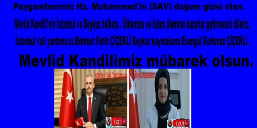 Peygamberimiz Hz. Muhammed'in (SAV) doğum günü olan Mevlid Kandili'nin İstanbul ve Beykoz halkına . Ülkemize ve İslam âlemine huzurlar getirmesini dileriz İstanbul vali yardımcısı.Mehmet Fatih ÇİÇEKLİ Beykoz kaymakamı.Esengül Korkmaz ÇİÇEKLİ Mevlid Kandilimiz mübarek olsun.