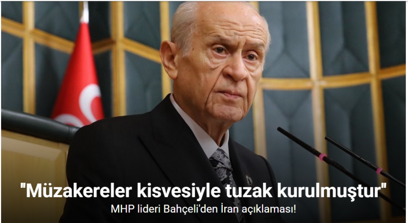 Bölgesel ve küresel tansiyonun çok yükseldiği bir dönemde Türkiye olarak sağduyu ve soğukkanlılıkla hareket etmesinin politik ve diplomatik tutum tercihi olduğuna dikkati çeken Bahçeli, "Böylesi alacakaranlık dönemlerde duygusal tepkilere, duyumsal tepkimelere itibar ve ihtimam gösterilmemesi devlet ve millet aklının müşterek hassasiyeti olmalıdır. Bu kapsamda etrafında dolaştığımız asıl mevzumuzun tam ağırlık merkezine geldiğimiz takdirde mahut sıcak gelişmeler karşısındaki yorum ve değerlendirmelerimizi aklıselim bir siyasi ve ahlaki çerçevede yapmamız kaçınılmazdır. ABD’nin siyonizmin tahrik ve tertibine gelerek İran’a saldırması bölgesel ve küresel dengeleri sakatlayacak mahiyettedir. Bu saldırganlık gayri meşrudur. Bu saldırganlık gayri hukukidir. Bu saldırganlık gayri ahlakidir. Uluslararası hukuku takan ve tanıyan yoktur. Dünyada orman kanunlarının geçerli olmadığını iddia edecek bir akıl ve mantık sahibi hiç kimseden bahsedilemeyecektir. Hani müzakereler sürüyordu? Hani görüşmeler devam ediyor; anlaşmaya ve uzlaşmaya yakın olunduğu iddia ediliyordu?" ifadelerine yer verdi.