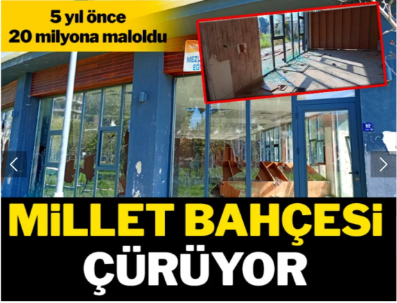 34 bin 194 metrekare üzerine kurulu millet bahçesi içerisinde bulunan kafeterya ve restoran binalarının camları kırıldı, içindeki malzemeler yerlerde çürümeye terkedildi. Bahçedeki çocuk oyun alanları ve oturma grupları tahrip edilerek kullanılamaz hale getirildi.