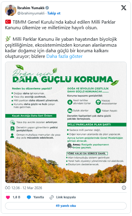 Bakanlığın paylaştığı bilgilendirme görselinde ise düzenlemenin temel amaçları doğanın daha etkin korunması, yasa dışı avcılığın azaltılması, milli parkların daha düzenli yönetilmesi ve kurumun daha hızlı çalışır hale getirilmesi olarak ifade edildi.
