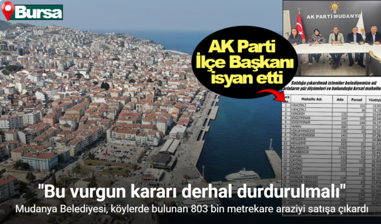 AK Parti Mudanya İlçe Balkanı Arif Bayrak, "Mudanya kamuoyuna acil duyurumuzdur" adı altında yaptığı açıklamasıyla Mudanya’nın çeşitli mahallelerinde 24 parça toplam 803 bin metrekare arazinin satışı hakkında duyduğu endişeyi dile getirdi. Bayrak şunları söyledi: "Mudanya Belediyesi yönetimi, ne yazık ki son 11 yılda olduğu gibi, bir kez daha halkın malını, Mudanya’nın bereketli topraklarını satışa çıkarma hazırlığı içerisindedir. Ekim 2025 tarihli Belediye Meclis gündemine CHP grubu tarafından sunulan önergeyle, tamı tamına 803 bin 186 metrekare büyüklüğünde, yani 112 futbol sahasına eşit, devasa bir arazi parçası gözden çıkarılmıştır. Buradan açıkça ilan ediyoruz: Bizler, bu süreci büyük bir üzüntü ve halkımız adına endişeyle takip ediyoruz. Mudanya halkının en değerli varlıkları, şeffaflıktan uzak, istişaresiz ve hesapsız bir şekilde elden çıkarılmak istenmektedir. Çayönü, Yörükyenicesi, Emirleryenicesi, Söğütpınar, Yaman, Eğerce, Dereköy, Hançerli, Mesudiye, Çekrice, Trilye ve Balabancık’taki bu tarlalar, çiftçinin, köylünün, Mudanya’nın nefesidir. Bugün bu toprakları "atıl" diyerek satmak isteyenler, yarın Mudanya’da üretimden, yerelden, kırsaldan bahsetme hakkını kaybedecektir"