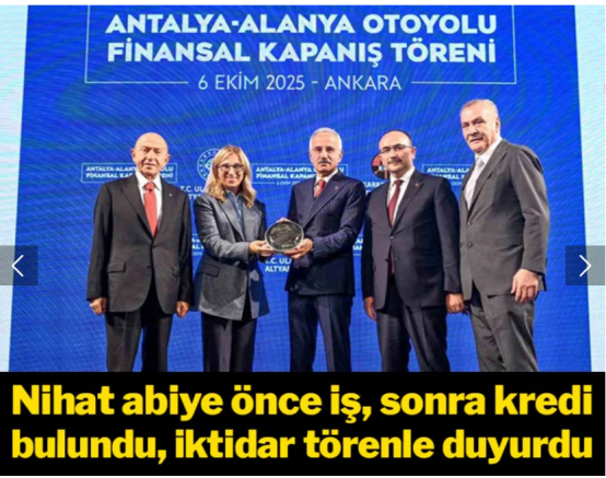 İktidarın gözde müteahhitleri ile ilişkileri gün geçtikçe daha da tuhaf etkinliklere sahne oluyor. Kamu’da düzenlenen hemen her ihaleyi alan bu şirketlerin yapacağı ve işleteceği yolların temel atma etkinlikleri düzenleniyor ve bu etkinliklere devlet erkanı katılıyor. Türkiye bu tabloya alışmak zorunda kalmışken devlet şimdi de bu müteahhitlerin yapacağı yollar için kredi bulmasını da kutlar oldu. Nihat Özdemir’in sahibi olduğu Limak Holding’in Antalya-Alanya otoyolu için toplanan 1.7 milyar Euro’luk krediye ‘Finansal Kapanış Töreni’ düzenlendi. Törene Ulaştırma ve Altyapı Bakanı Abdulkadir Uraloğlu da katıldı.