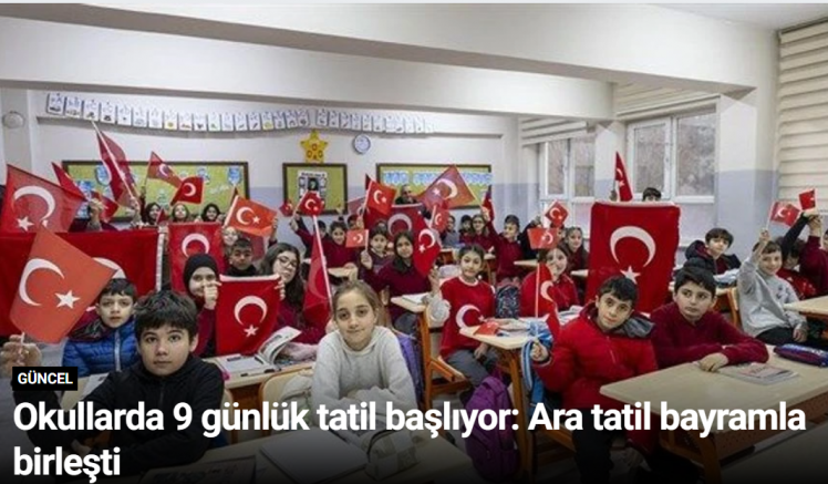 Milli Eğitim Bakanlığı takvimine göre ikinci dönem ara tatili, yarın çalacak son ders ziliyle başlayacak. Öğrenciler hafta sonu ile birlikte toplam 9 gün tatil yapacak.