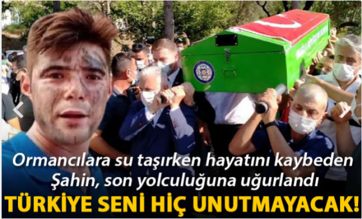 Marmaris'teki bir otelde garson olarak çalışan Şahin Akdemir, gönüllü olarak, dün ilçede çıkan orman yangınını söndürme çalışmalarına katıldı. Akdemir, motosikletine yüklediği koliler dolusu suyu yangına müdahale eden ormancılar ve itfaiye ekiplerine taşıdı. Bölgeden ayrılırken motosikletiyle kaza yapan lise mezunu Akdemir, alevlerin arasında kalınca yaşamını yitirdi. Akdemir'den geriye sosyal medyadan yaptığı duygulandıran, "Su taşımaya devam, yangıncılara su taşıyacağız yine, Allah hayırlarımızı kabul eylesin" mesajı kaldı.