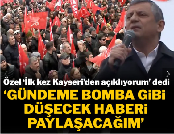 CHP, Silivri Cezaevi'nde tutuklu bulunan cumhurbaşkanı adayları Ekrem İmamoğlu'nun serbest bırakılması için başlattıkları mitinglerin 75. adresi Kayseri oldu. Özel, "İlk kez Kayseri meydanından Türkiye gündemine bomba gibi düşecek haberi söyleyeceğiz." dedi. Özel, "Gizli tanık Ahmet Taşçı 'Pişmanım' dedi, bir gizli tanık daha çekildi." açıklamasını yaptı.